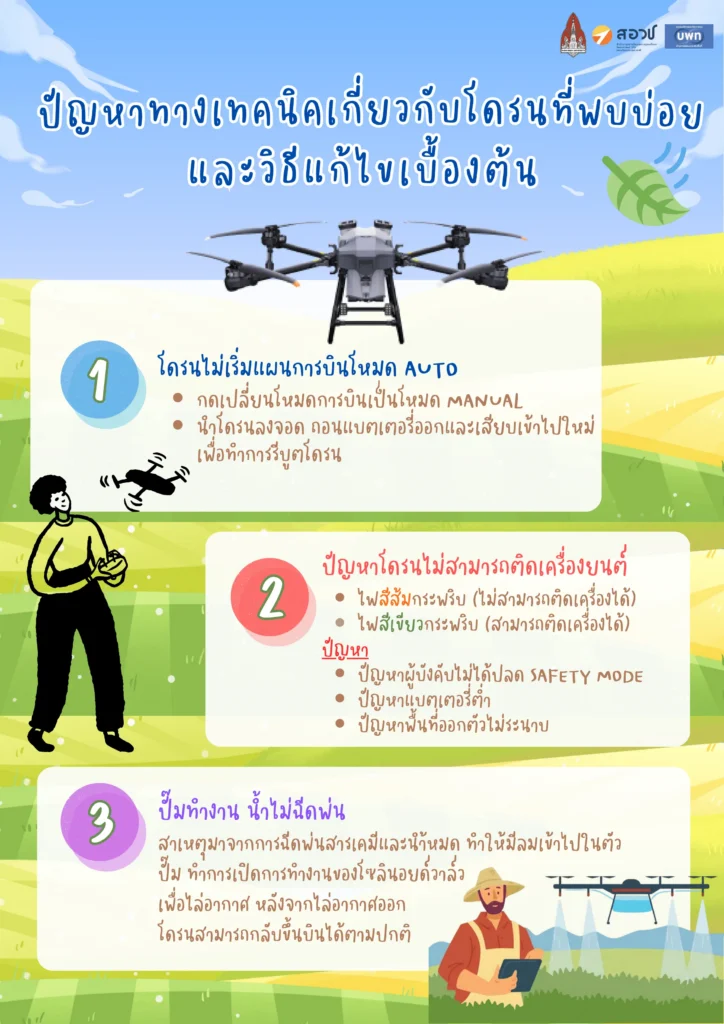 ในระหว่างการใช้งานโดรนฉีดพ่น อาจเกิดปัญหาทางเทคนิคที่ส่งผลต่อการทำงานหรือการบินของโดรนได้